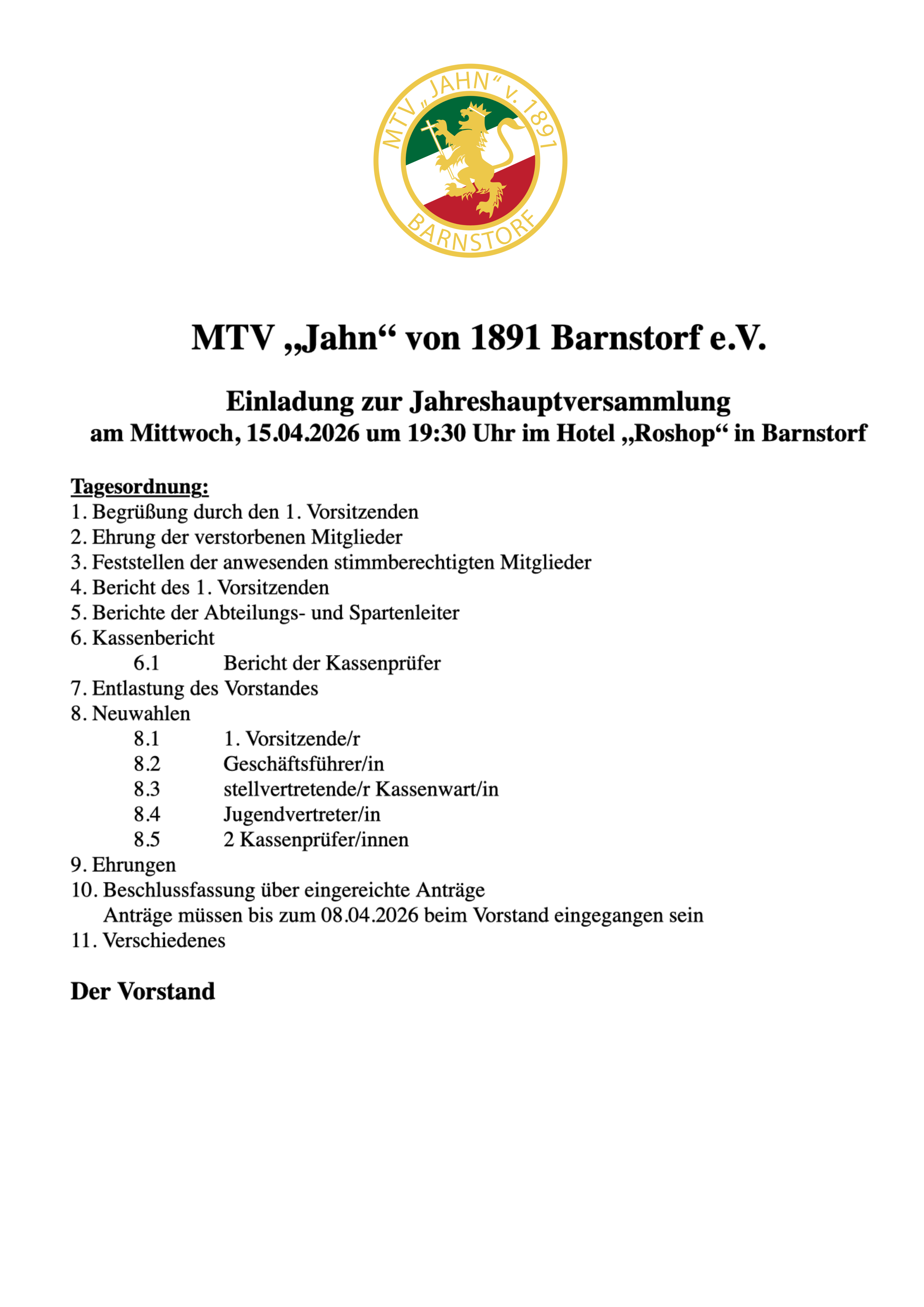 Der MTV Barnstorf ist mit ca 850 Mitgliedern der stärkste Sportverein der Samtgemeinde Barnstorf und blickt auf eine lange Tradition zurück. Diese begann im Jahre 1891 mit 34 Mitgliedern – seit dem Gründungsjahr ist die Anzahl der Mitglieder stetig gewachsen und diese können die unterschiedlichsten Angebote unseres Vereins nutzen.